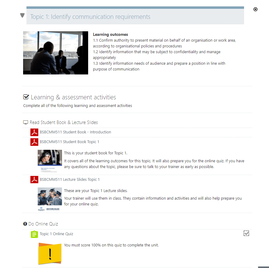 While the steps above seem linear, the process was iterative, requiring consultation with stakeholders at each step. To ensure the site navigation and layout were intuitive, I ran focus groups with students and trainers to learn more about how they navigate units, their preferences and wish-lists. The “Sample Course- BSBCMM511” illustrates the contents and layout.