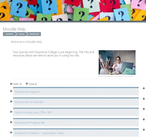 • Student Help course with 15 short 1-minute videos on how to use each of the features in Moodle – see “Moodle Help” example.