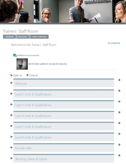 • Trainer Staff Room in which trainers could access all training resources. By housing the Staff Room within the LMS, we could simplify the number of platforms required for trainers to access curse resources – see “Staff Room” example.